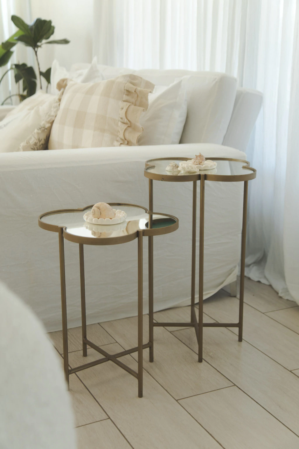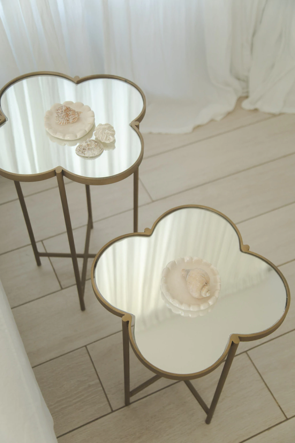 Set de dos mesas con forma de flor de hierro pintado color óxido y con espejos vintage