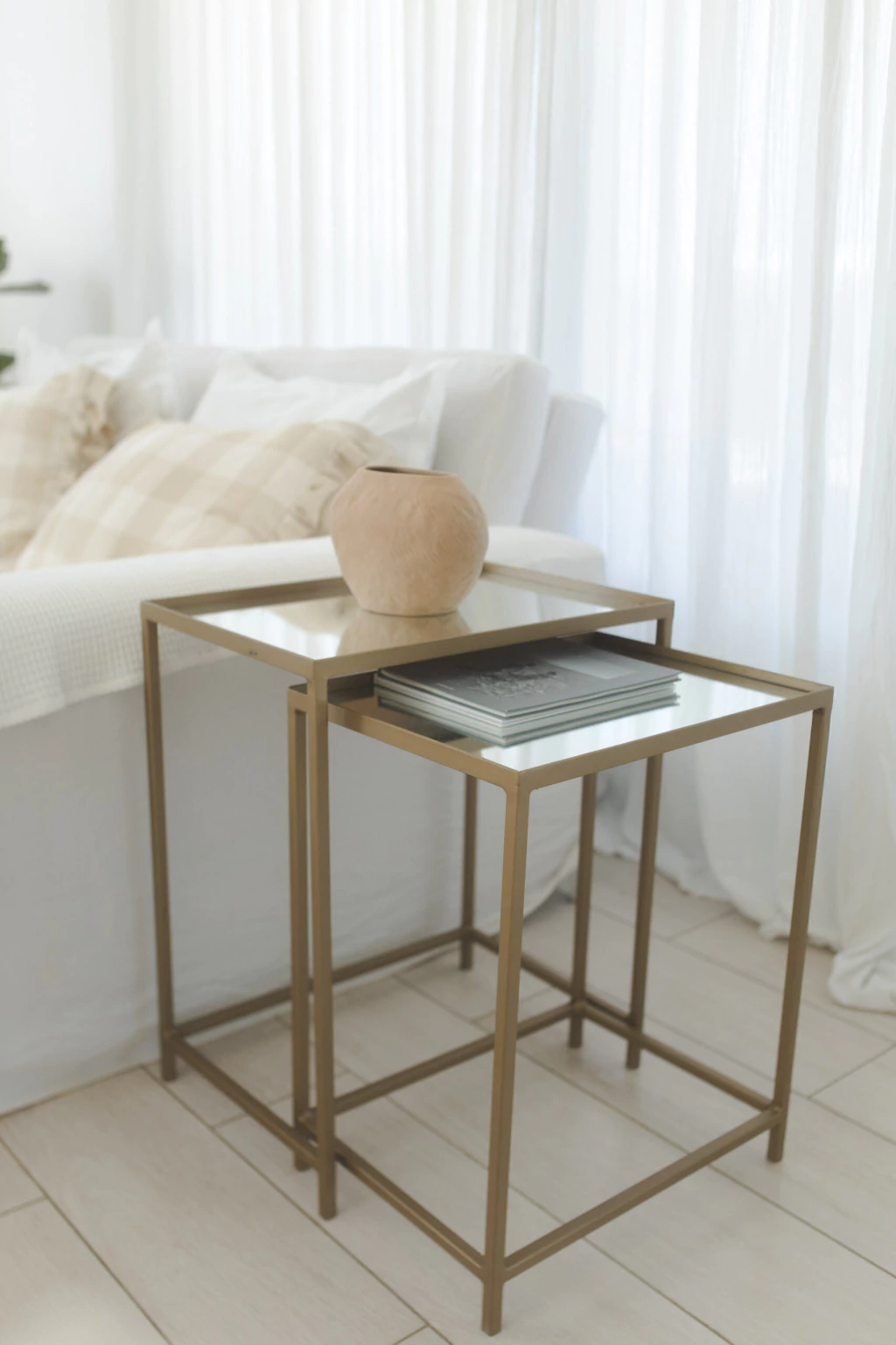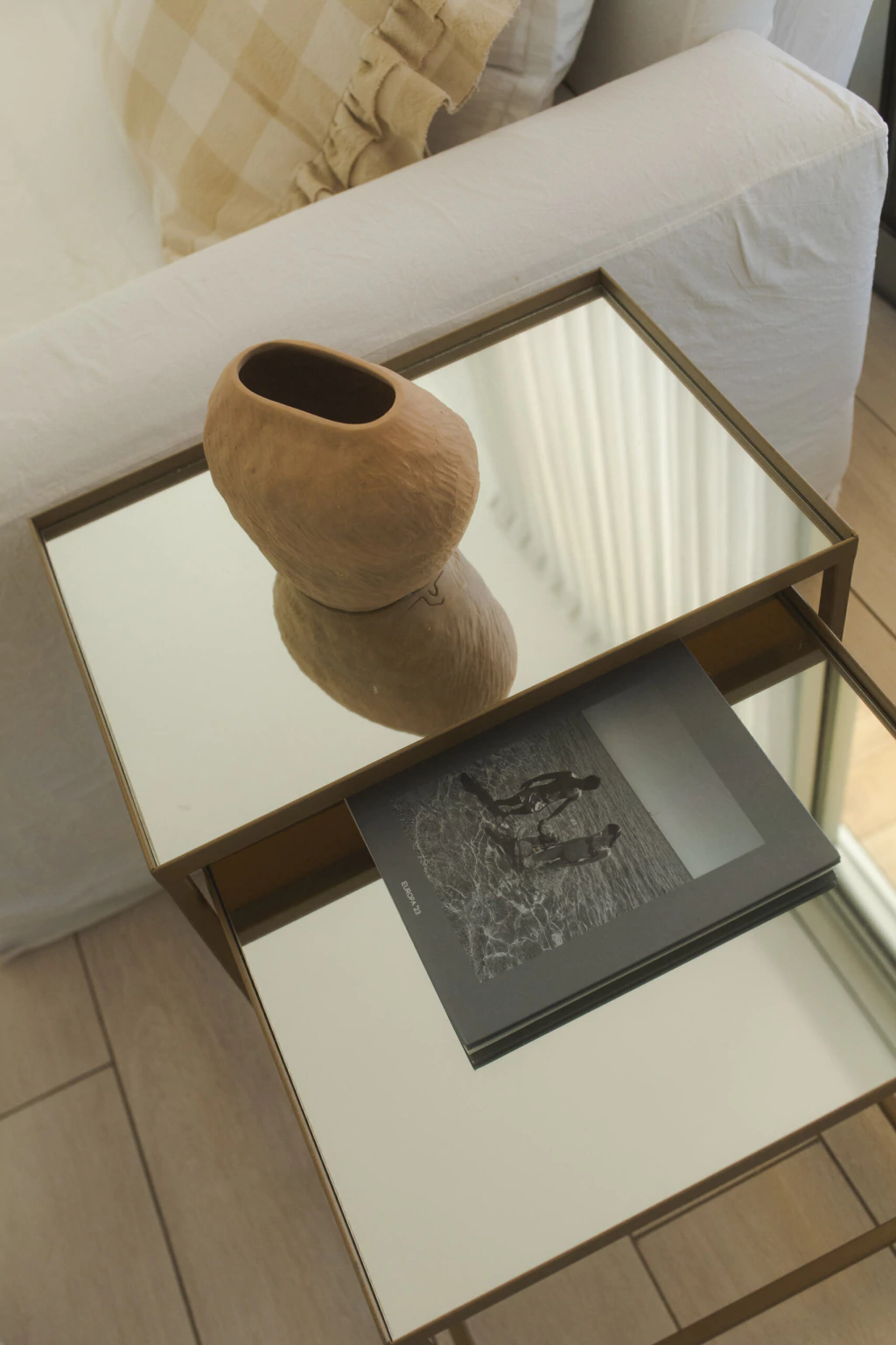 Set de dos mesas rectangulares de hierro pintado color óxido y con espejos vintage